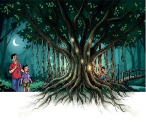 তারা দুজন হাঁটছে, হাঁটতে হাঁটতে একসময় বটতলার কাছাকাছি এসে পড়লো। ব্রিজের উপর উঠে সামনে বটগাছের গোড়ার দিকে তাকাতেই ধক করে উঠলো ওদের বুকের ভেতর। মোজাম্মেল, ও মামা ওটা কী বলে মামাকে জড়িয়ে ধরলো। ভূতের মতো কী যেন সটান হয়ে বটগাছটায় হেলান দিয়ে চুপচাপ দাঁড়িয়ে আছে। মাঝে মধ্যে মশার কামড়ে নড়ে উঠছে। কিন্তু মুখ দিয়ে কোনো কথা বলে না। ভয়ে মনটা চুপসে গেল। শরীর দিয়ে ঘাম বেরুতে লাগলো। আশপাশে কোনো বাড়িও নেই যে কাউকে ডাকবে।