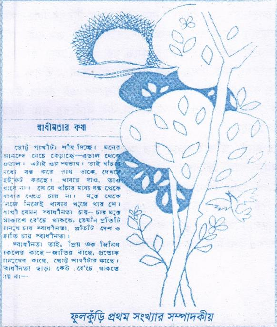 মাসিক ফুলকুঁড়ির প্রথম সংখ্যার সম্পাদকীয়তে বলা হয়েছিল, “পাখী যেমন স্বাধীনতা চায়- চায় মুক্ত আকাশে বেঁচে থাকতে, তেমনি প্রতিটি মানুষ চায় স্বাধীনতা, প্রতিটি দেশ ও জাতি চায় স্বাধীনতা।”